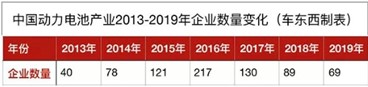 2019年,新能源补贴退坡幅度超过50%,其产品销量同比 “五连跌”,造成上游动力电池企业淘汰出清。同时,白名单废除,外资巨头动力电池企业再次进入国内,抢占二三线动力电池企业市场。这一年,动力电池企业数量只剩下69家。