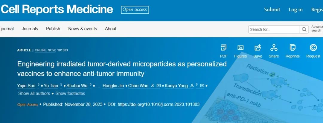 近日,华中科技大学研究人员在国际权威期刊《Cell Reports Medicine》上发表了题为“Engineering irradiated tumor-derived microparticles as personalized vaccines to enhance anti-tumor immunity”的研究论文,该研究中,研究人员介绍了一种利用辐射后的肿瘤细胞衍生微粒(RT-MPs)构建疫苗的策略,该疫苗具有个性化和广谱的抗原库,可诱导全面的抗肿瘤效应。研究人员利用SARS-CoV-2刺突蛋白和TGFBR2开发了RT-MPs。该刺突蛋白和TGFBR2高表达诱导固有免疫应答,改善免疫抑制性TME,从而促进T细胞活化和浸润,最终抑制肿瘤生长。本研究为生产有效的个体化抗肿瘤疫苗提供了策略。