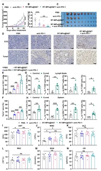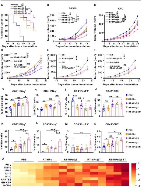 图5:RT-MPs@S&T显示出增强抗肿瘤免疫和抑制肿瘤生长的能力