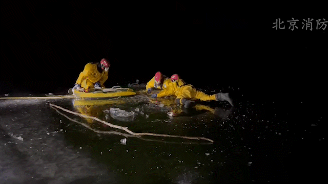 2023年1月1日,北京市密云区,1名男性被困在冰下,消防救援人员使用救援担架等设备救出被困人员,被困人员已无生命体征。