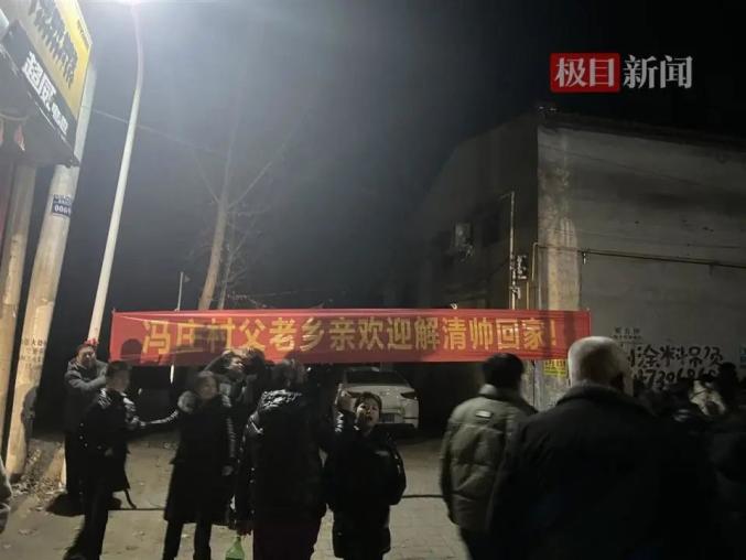 昨天晚上6时30分许,在威县老家的冯庄,已经有不少乡亲们早早等在门口,拉起了横幅“欢迎解清帅回家”,等待一家人的到来。