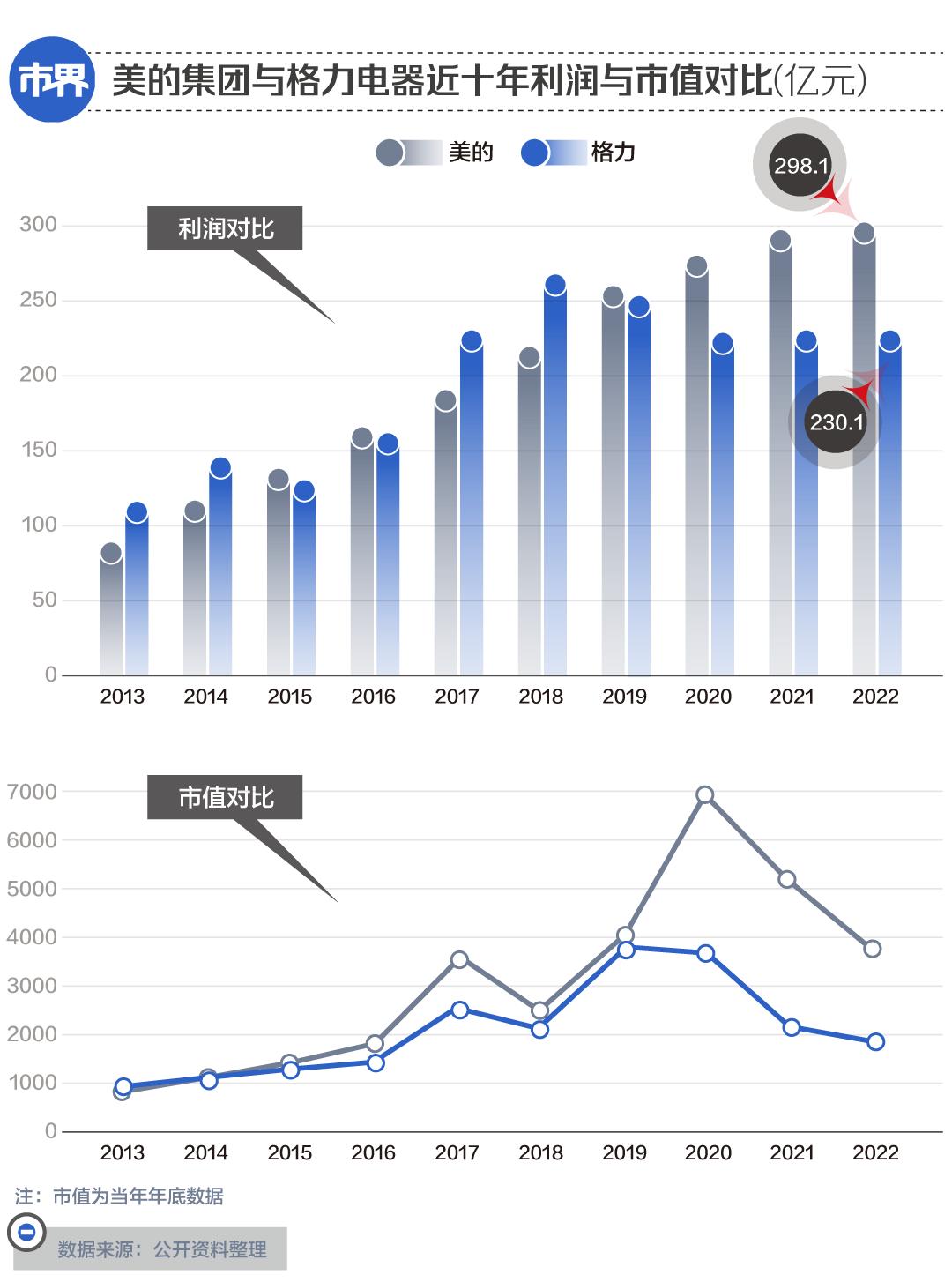 反观美的集团,则在2012年正式上位的方洪波带领下,迅速通过裁员、砍掉不盈利板块及停止盲目扩张等“铁腕”措施,不仅成功躲过“家电寒冬潮”,甚至还实现对“董小姐”掌控的格力电器,在业绩与市值等方面的全方位超越,成为名副其实的A股“家电一哥”。