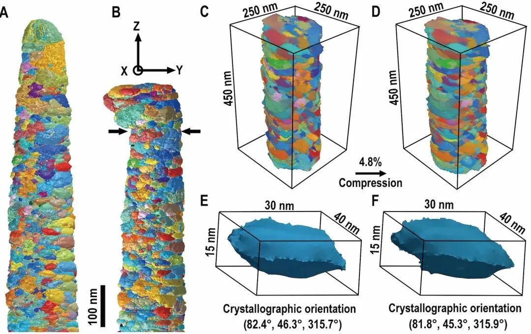 纳米金属镍变形前(A)和变形后(B)三维形貌与晶体取向变化。重庆大学供图本研究利用三维取向成像技术,首次实现了纳米金属塑性变形的三维电镜研究。发现了纳米金属塑性应变可恢复的反常现象,并揭示了这一现象的物理本质。本工作的新发现发展了纳米金属塑性变形理论,将为先进纳米结构材料研发、纳米材料使役行为的预测和控制以及微纳器件功能优化提供理论指导。