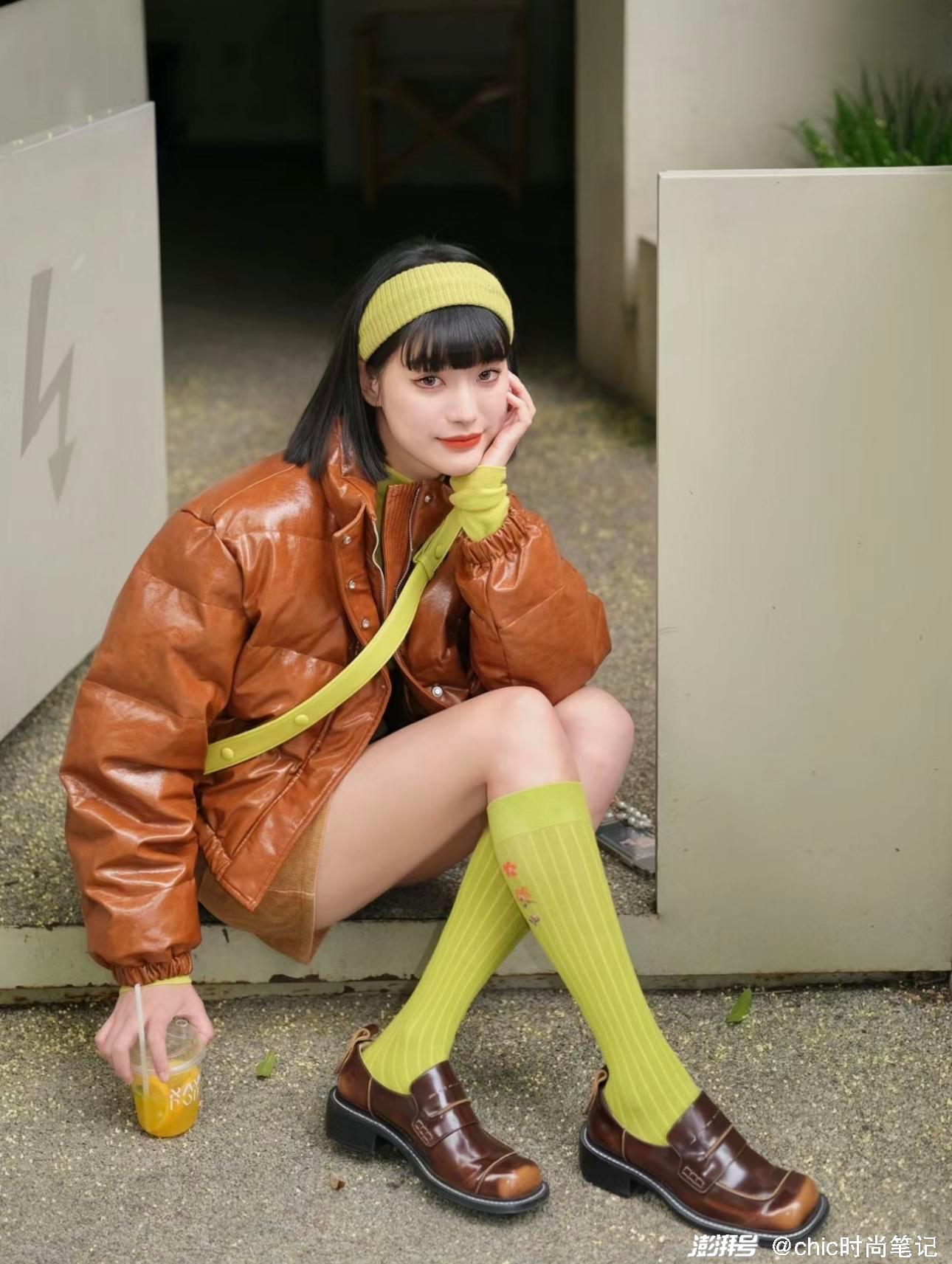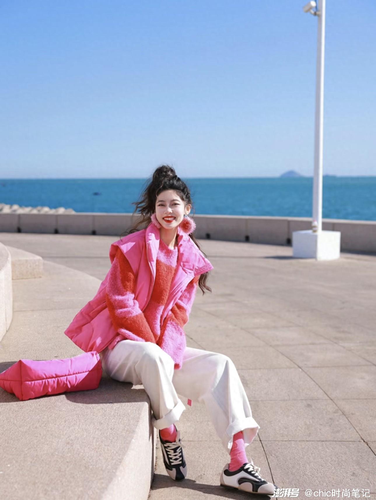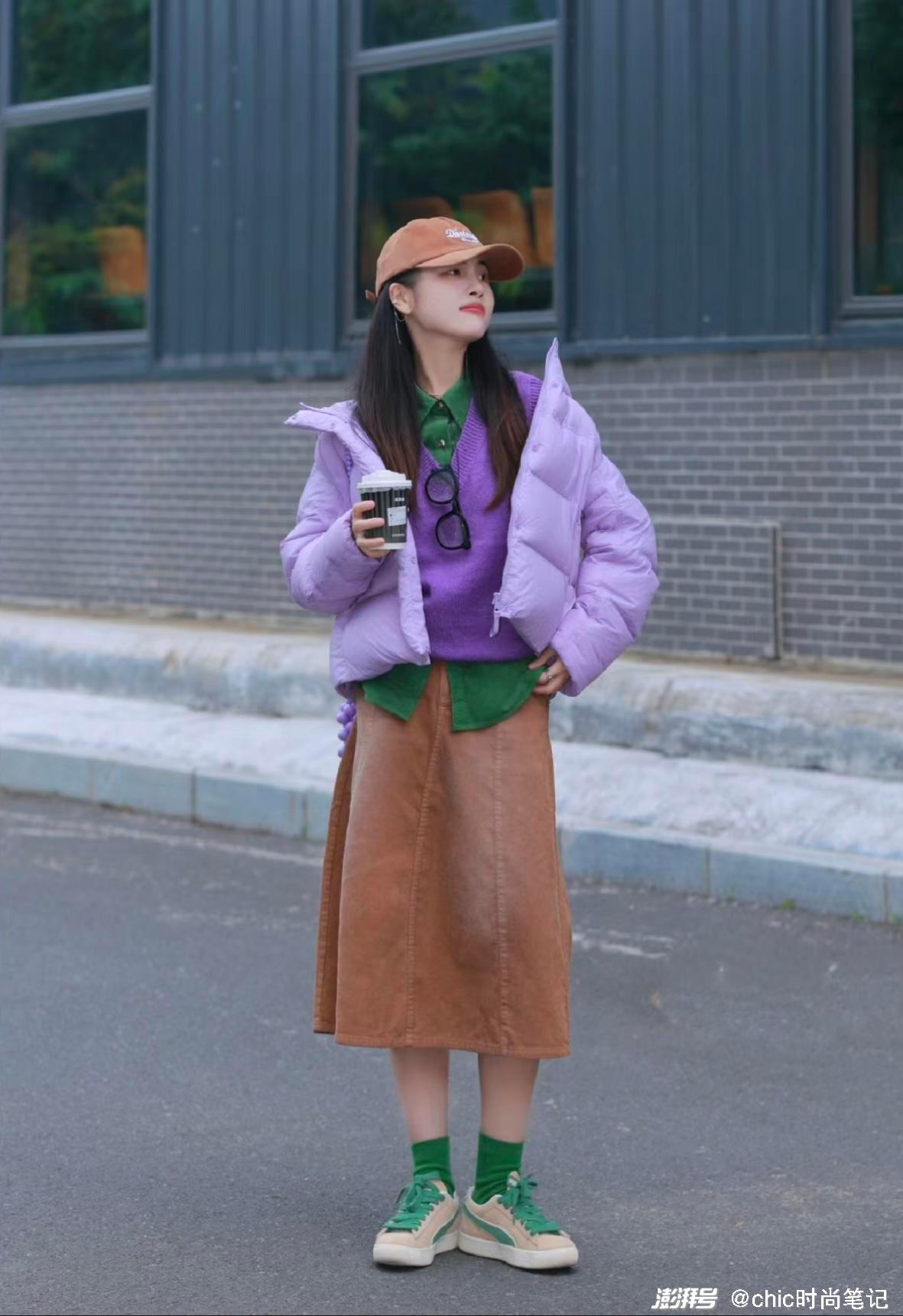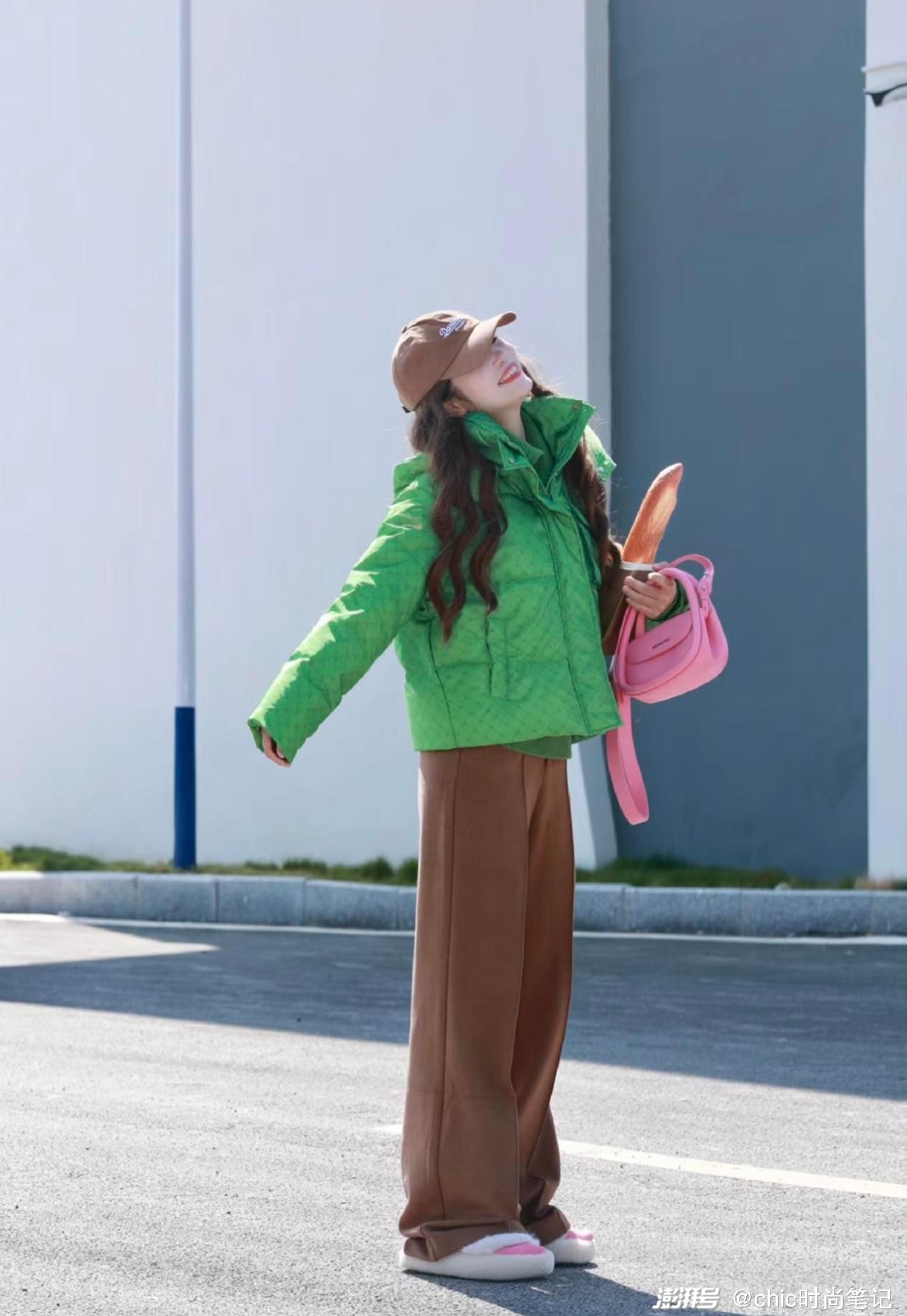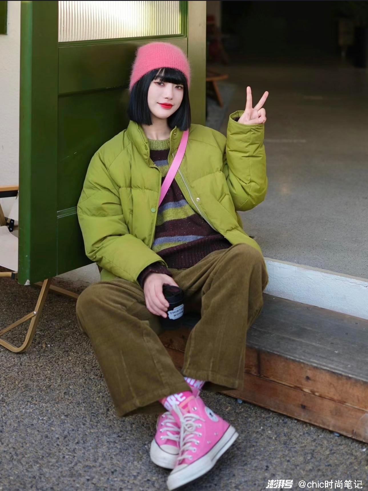 今年其实很流行对冲色的搭配,比如绿色毛衣搭配绿色羽绒服外套,但却选择搭配粉色鞋子和帽子等对冲色作为装饰,突出色彩带来的视觉享受。