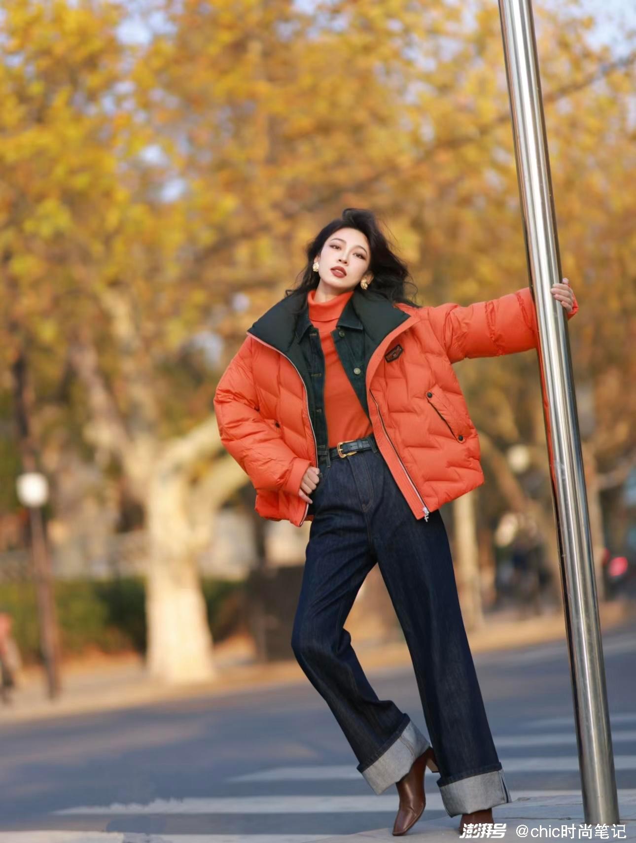 橙色是复古的氛围感,所以在选择橙色羽绒服的时候,我们可以搭配黑色或者深色的单品,比如黑色直筒牛仔裤和棕色皮靴,都是打造复古摩登感的时尚利器。