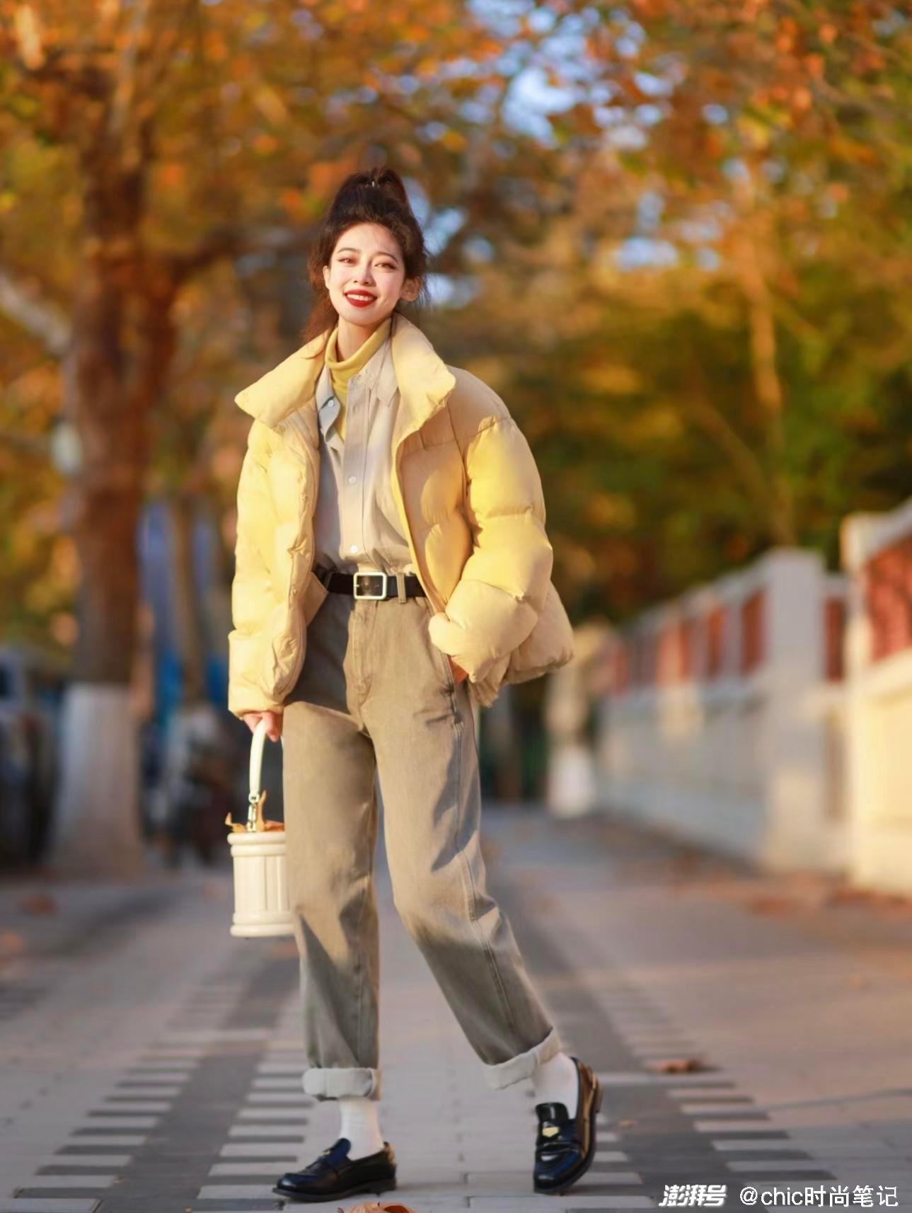 黄色羽绒服可以搭配卡其色单品,卡其色毛衣叠穿同款衬衫,下身同样选择卡其色工装裤,一整套造型治愈而松弛。