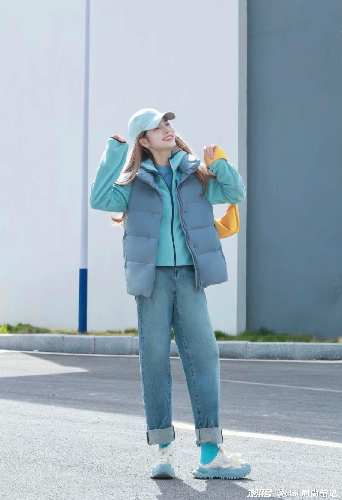 青色系穿搭在冬天会显得清冷又舒适,青色羽绒服搭配浅色牛仔裤,简约又百搭,颜色柔和而自然。