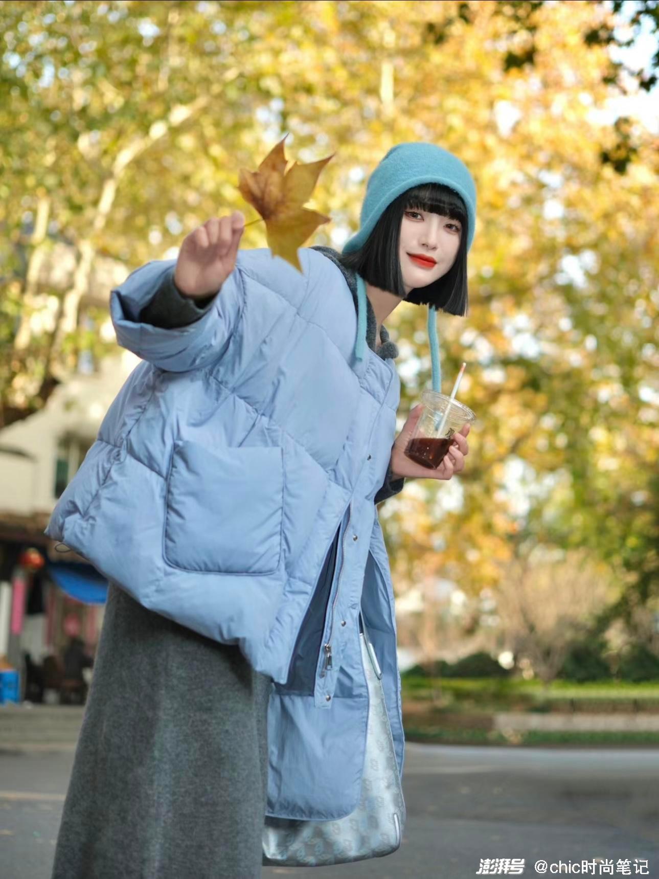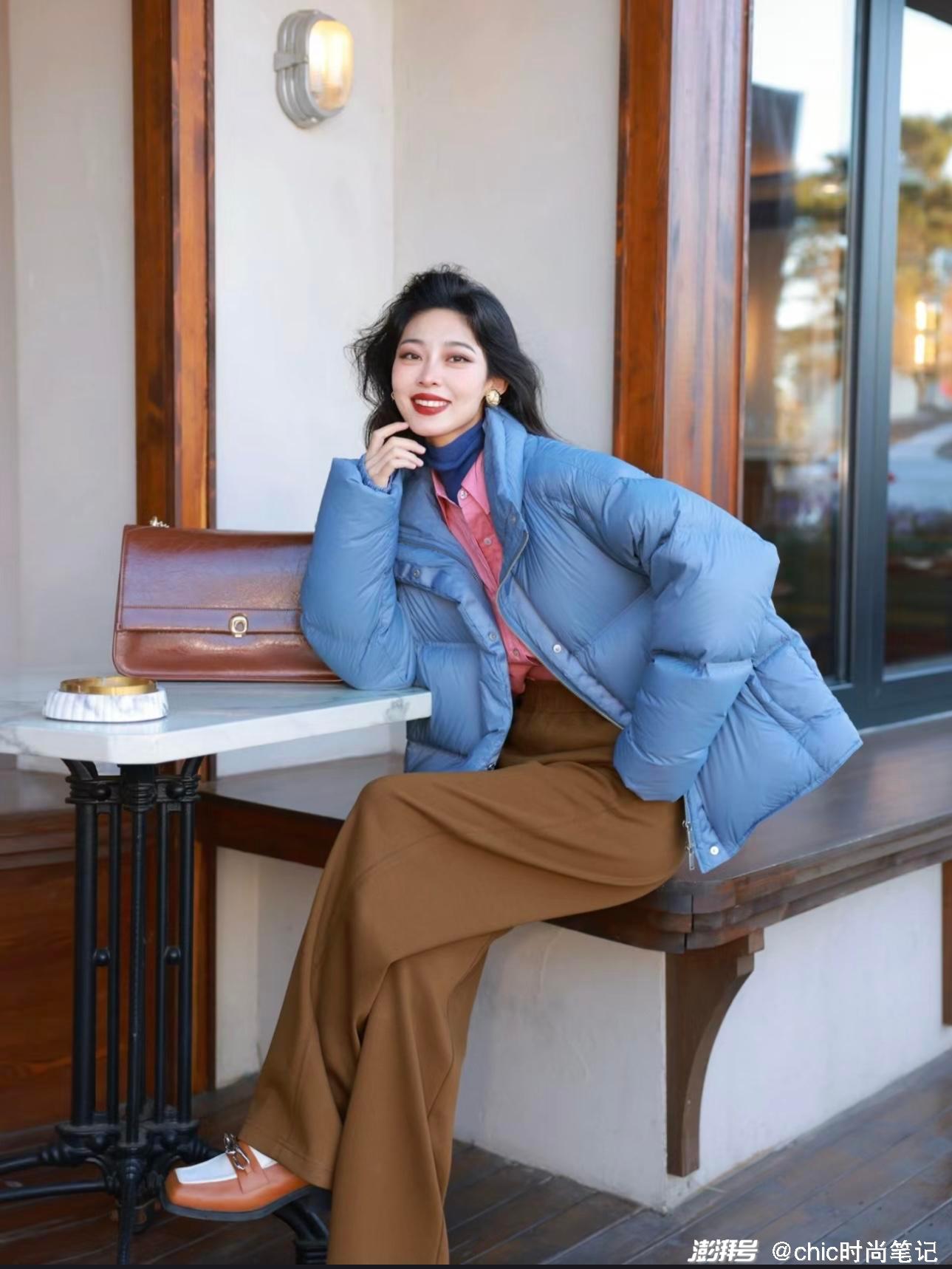 小编个人可太爱蓝色了!浅蓝色羽绒服可以搭配灰色裤子,有一种雾霾蓝的朦胧感,记得要选择浅灰色作为搭配,会更有清冷的feel。
