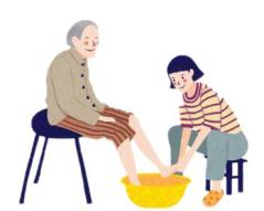 人老脚先衰,老人容易下肢无力,常患有骨膜炎、足跟骨刺等,一旦足部受冻,容易引发上呼吸道感染及腰腿酸痛等症。老年足部保暖,关键是选好合适的鞋袜(如布底绒里棉鞋、毛里棉鞋或毛皮鞋及毛巾袜均适宜),平时少坐多走动,最好每晚睡前用热水泡脚10~15分钟,以促进下肢血液循环,既有利消除疲劳,又能帮助尽快入梦乡,且睡得香甜。