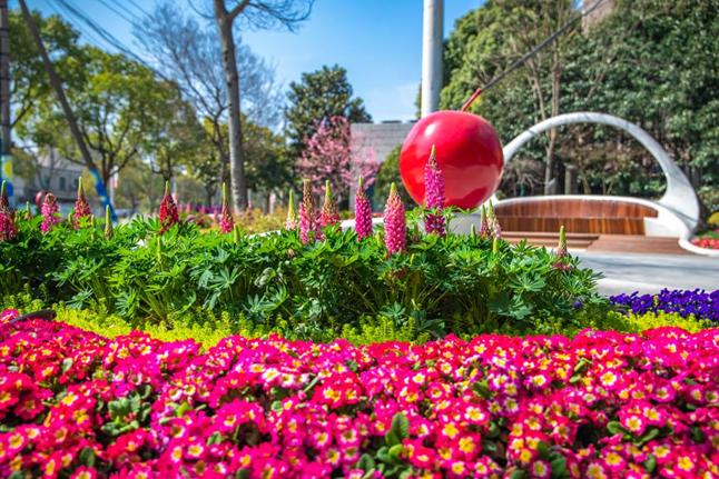 张杨北路东煦路沿线原为普通的灌木绿化带,在走访调研附近居民需求后,将自然景观与休憩娱乐相结合,打造成为精致的口袋花园。在改造提升过程中,增加了开花地被与花坛花境,引入四季开花植物,既确保“绿化”,又增强了“彩化”。同时,通过打开封闭空间,增设五彩斑斓的卡通兔、气球雕塑等,进一步增强了口袋公园的互动性、开放性,让居民真正能够走进绿地、观赏自然、享受惬意。