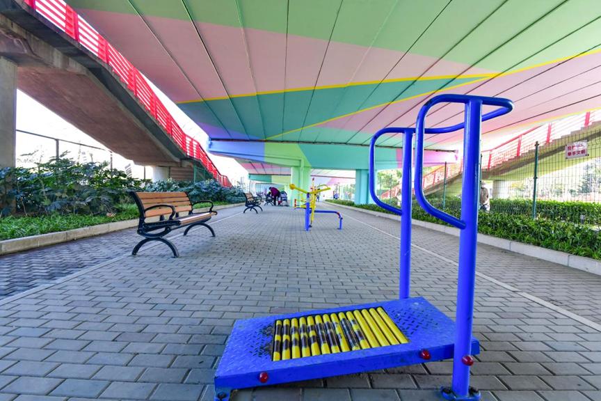 通过布置儿童游乐、体育健身设施,增设主体墙绘、景观照明等软性装饰,将赵家开北侧桥下空间打造成为集健身运动、休闲娱乐、景观绿地等复合型功能于一体的活动场所,将“沉睡”的桥下空间变身家门口的运动空间,已然成为可漫步、可欣赏、可阅读的“高行新地标”。