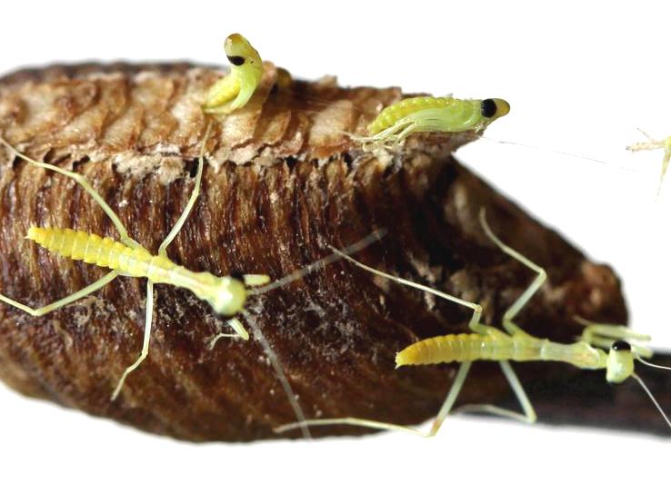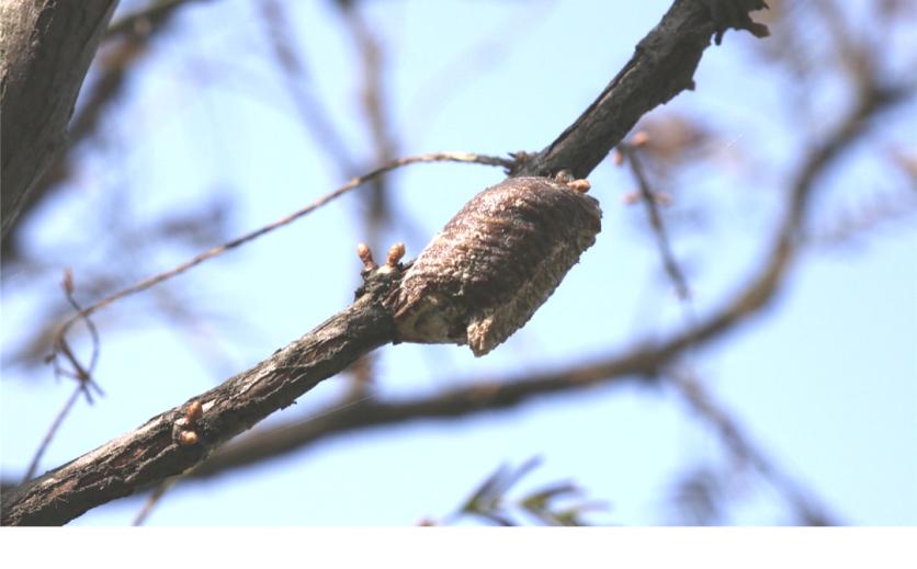 冬季树枝上的螳螂卵鞘春季螳螂若虫从卵壳中孵化