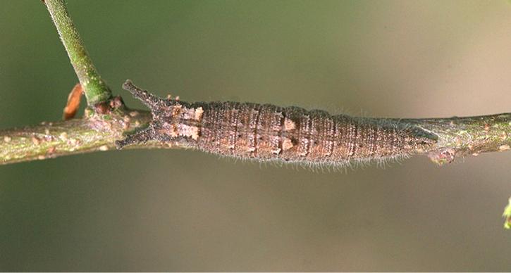 黑脉蛱蝶以幼虫越冬看!黑脉蛱蝶的虫宝紧紧地匍匐在树枝上,它的体色也模拟树皮的颜色,和周围环境融合在一起。