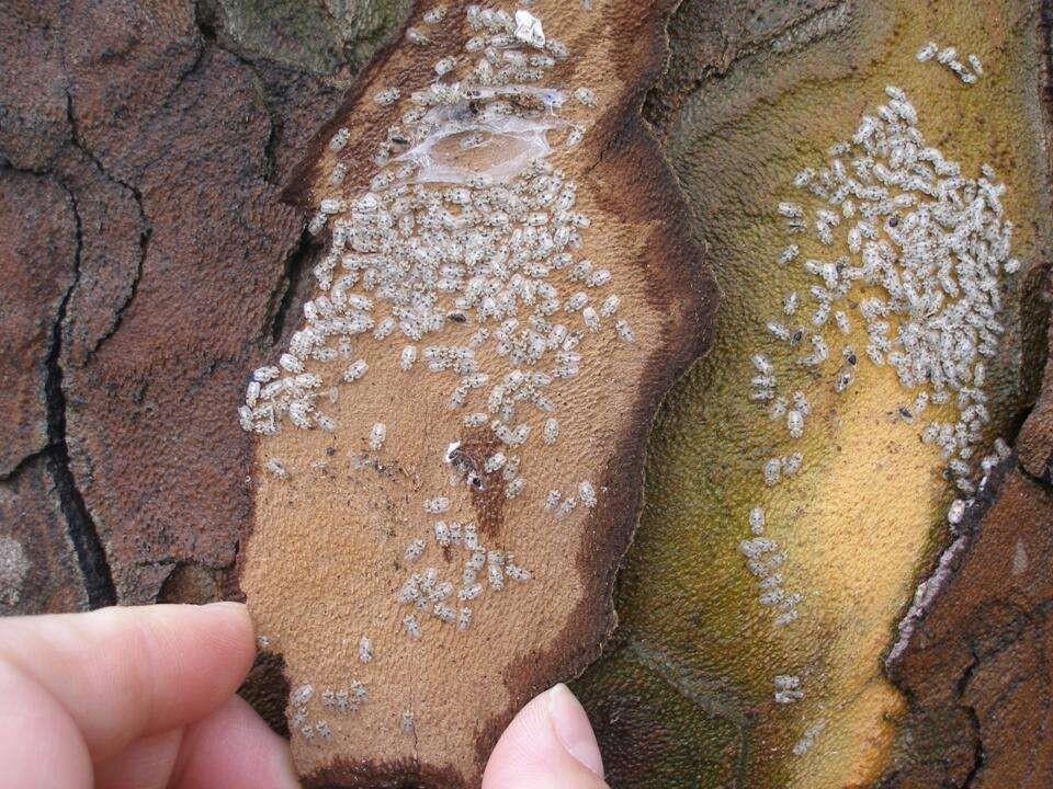 悬铃木方翅网蝽越冬有的昆虫比较偷懒,就近藏在寄主植物的起翘树皮下避寒,掀起一块悬铃木树皮,你或许就能发现躲藏在树皮下的悬铃木方翅网蝽成虫。绿化工人会根据它越冬特性,在清理树皮破坏它的越冬场所。