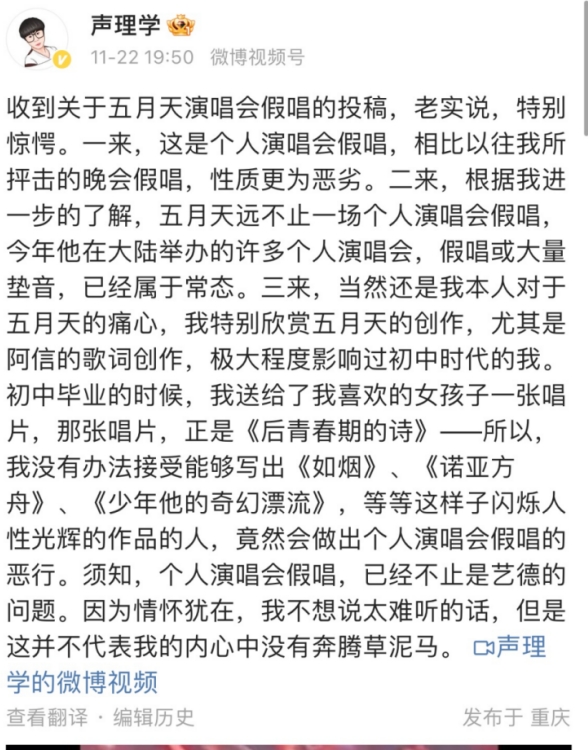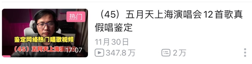 记者梳理发现,早在今年11月24日,就有音乐博主“声理学 ”收到来自粉丝的关于五月天演唱会“假唱”的投稿,后该博主在微博进行了分享,并评论认为五月天在个人演唱会上“假唱”性质恶劣。彼时这条微博并未有明显的舆论影响。随后11月30日,有从事音乐现场鉴定、音响设备鉴定的B站up主对粉丝发送的11月16日五月天演唱会12首歌曲视频进行了“鉴定”,认为包括《恋爱ing》《知足》《伤心的人别听慢歌》等经典曲目在内的5首歌,都属于“假唱”范畴。相关鉴定视频发布后迅速在全网引起广泛的关注和讨论。