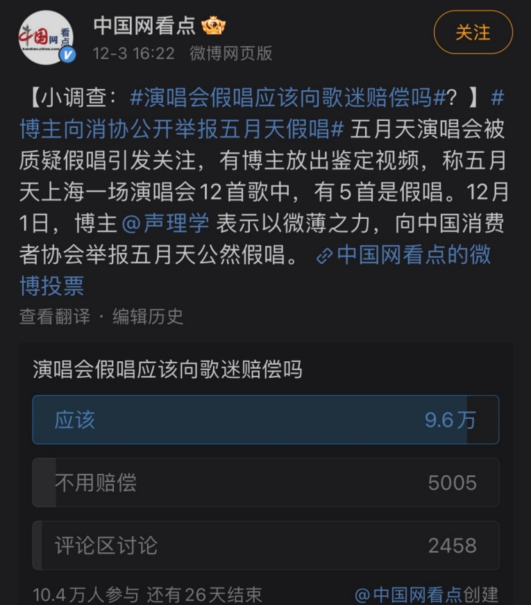 记者注意到,在疑似假唱事件曝出后,有部分消费者提出若最终鉴定为假唱,将申请退票。12月3日,微博平台上有媒体发起“演唱会假唱应该向歌迷赔偿吗?”的投票,截至12月6日18时,已有10.4万人参与,超92%的网友认为演唱会假唱应该向歌迷赔偿。