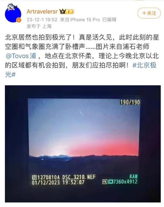 不仅纬度较高的东北多地,甚至在河北的承德、张家口的山区天文台、北京北部山区都瞥见了极光的疾驰旋舞,“北京极光”话题也一度攀登上热搜。
