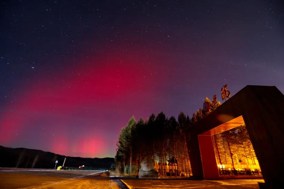 大部分地区所见的极光都呈现绚烂的红色,但在偏北的漠河等地还能看到绿色极光的明灭。图片来源:漠河市委宣传部尽管本轮极光活动已经结束,我们仍然可以借着这一罕见现象,来聊聊极光与地磁暴~