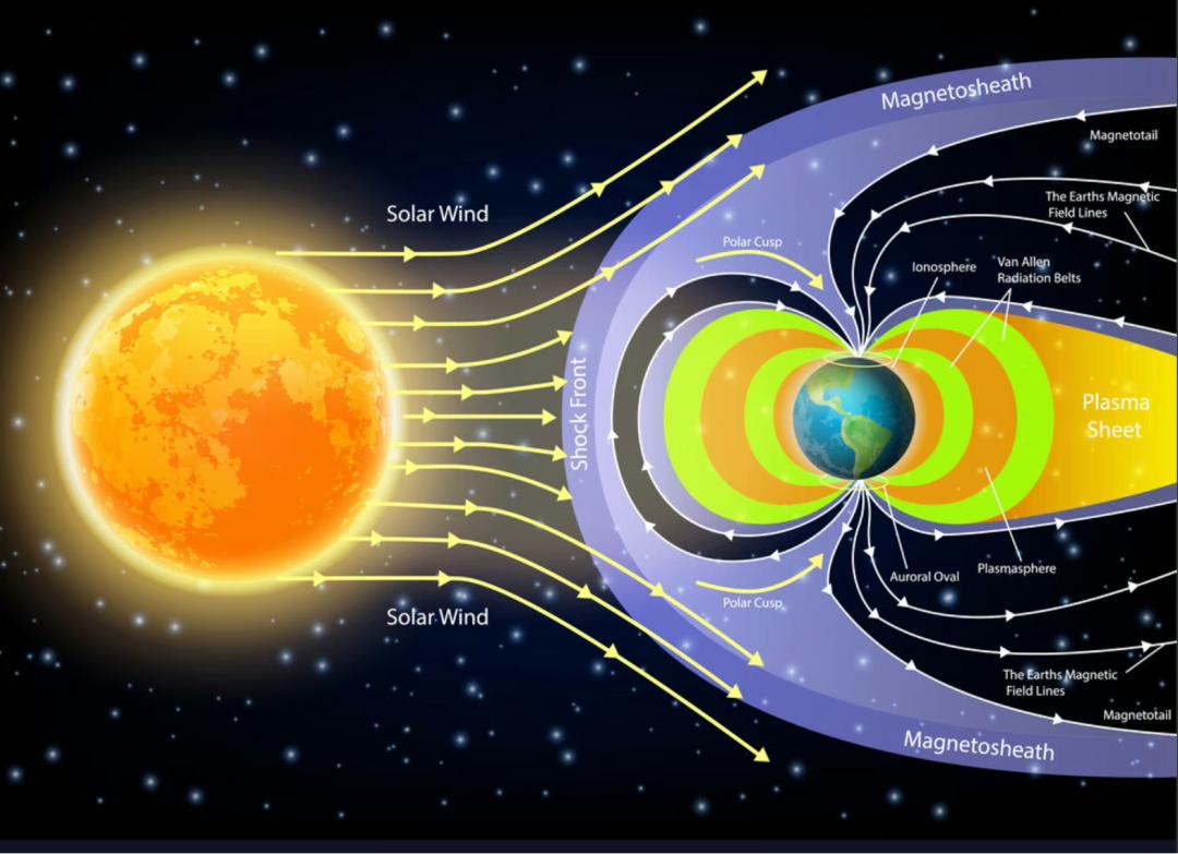 太阳高能粒子流(太阳风)对地球周边区域/地磁场相互作用的示意图2