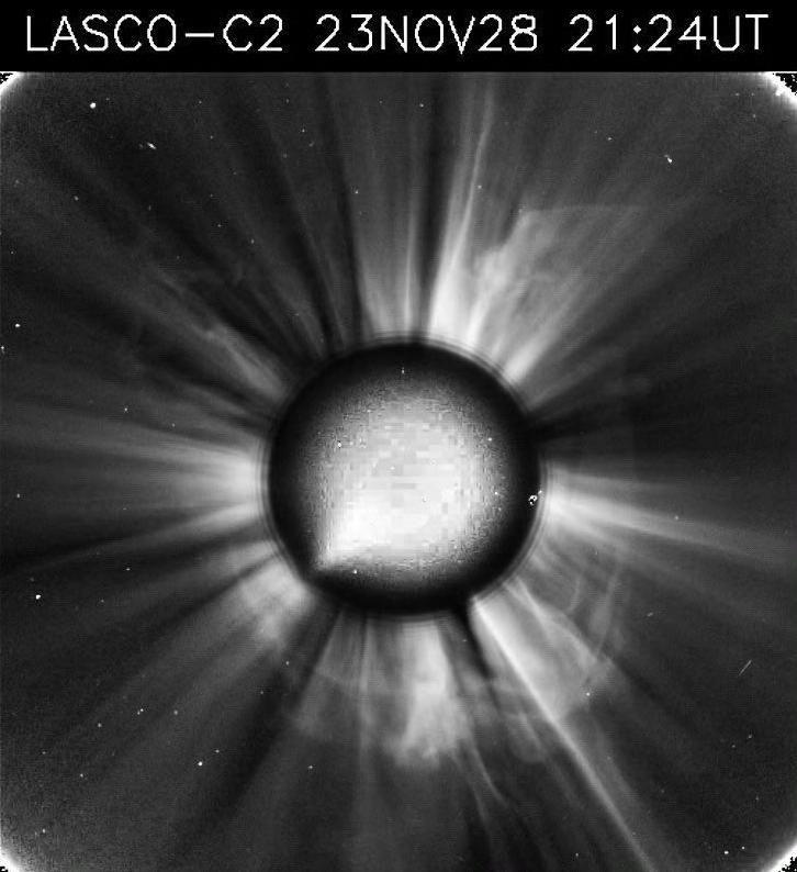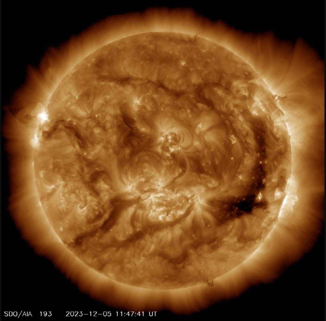 这次极光与大地磁暴事件的源头,正是北京时间 11 月 29 日凌晨,由一次太阳耀斑爆发引发、面向地球的晕状 CME 事件。虽然这次 CME 事件对应的太阳耀斑事件不强(仅为 M9.9 级),但由于特殊的晕状结构,也在 12 月 1 日抵达地球时造成了大磁暴事件。