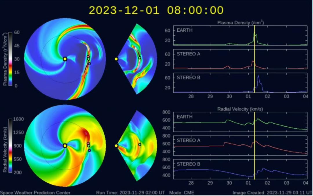 美国空间天气预测中心(SWPC)的CME模型图,上半部分为高能等离子体密度,下半部分为粒子流径向速度。左侧图中,黄道极坐标平面中心黄点为太阳,右侧绿点为地球,其余二者为探测卫星。图片来源:SWPC电·磁·光的交织: