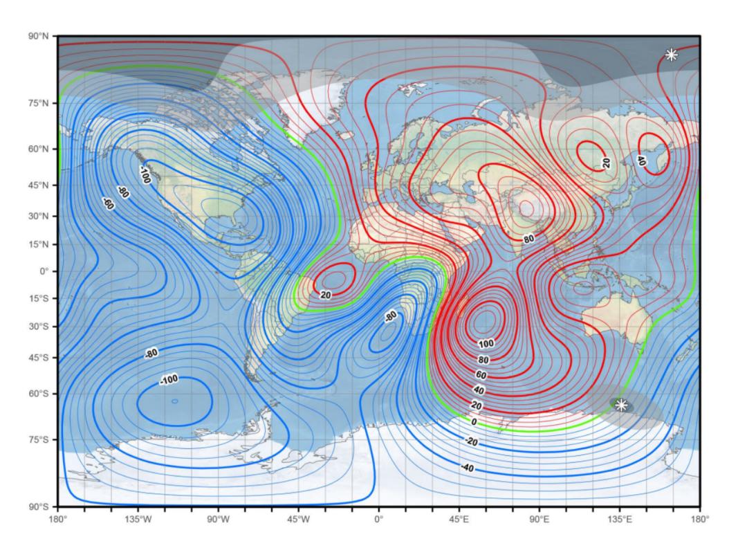 全球地磁场强度在2015-2020年间的年变化分布(单位:nT/a),正值(红线)为增强,负值(蓝线)为减弱。图片来源:世界地磁地图(2020版)