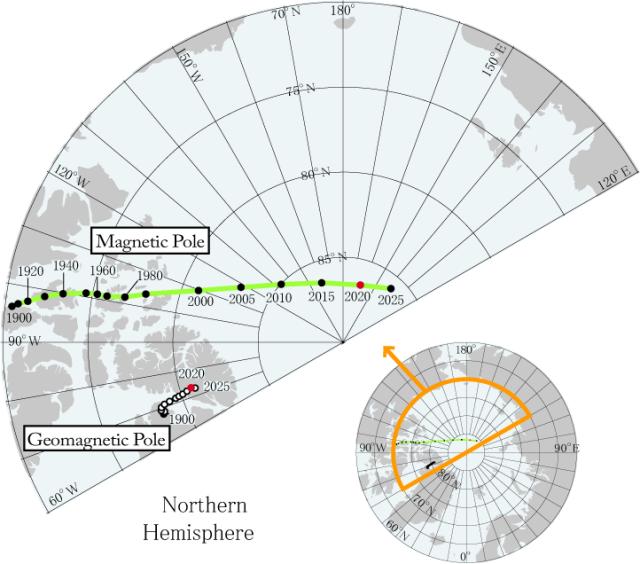 [4]Livermore, P.W., Finlay, C.C. & Bayliff, M. Recent north magnetic pole acceleration towards Siberia caused by flux lobe elongation. Nat. Geosci. 13, 387–391 (2020). [5]https://doi.org/10.1038/s41561-020-0570-9