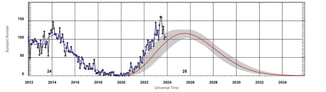 2012年以来,每月太阳黑子数的变化(折线)、早前预测的均值(红线)与1倍标准差的误差范围(灰色阴影,但现在看来预测比实际情况明显偏低了……)图片来源:SWPC参考文献