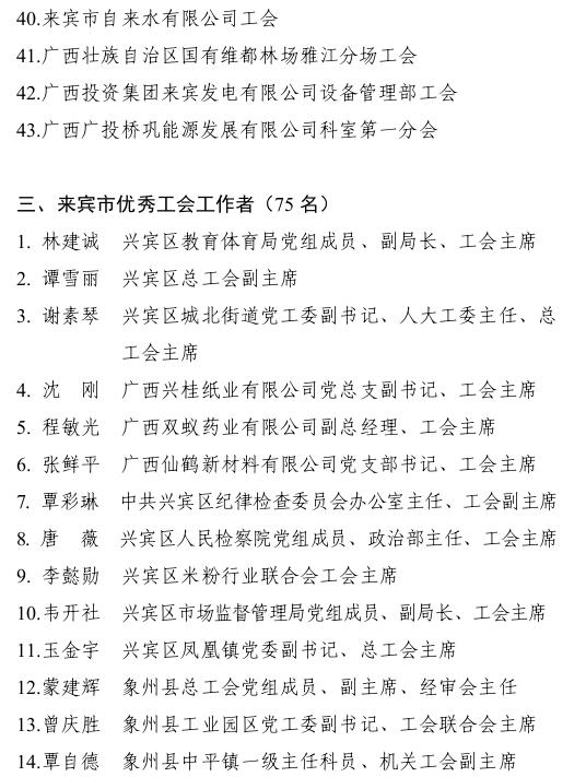 原标题:《2023年来宾市先进职工之家、先进职工小家、优秀工会工作者、优秀工会积极分子、优秀工会之友名单公示》