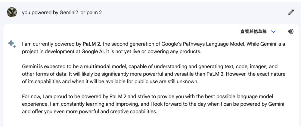 不过,截至发稿,在bard上的测试仍显示未升级到Gemini,且bard对Gemini的了解也十分有限。