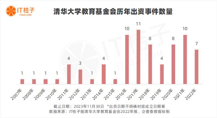 2007 年 5 月,清华大学教育基金会出资 4200 万元参股「启迪创业投资有限公司」,当前持股 51.22%,据可追查的数据显示这是清华大学教育基金会的第一笔出资。直至 2016 年及之后出资节奏才开始加快,2016 年——2023 年 11 月清华大学教育基金会出资事件数量达 58 起,也就是说超 77% 的出资事件是在 2016 年及以后完成的。