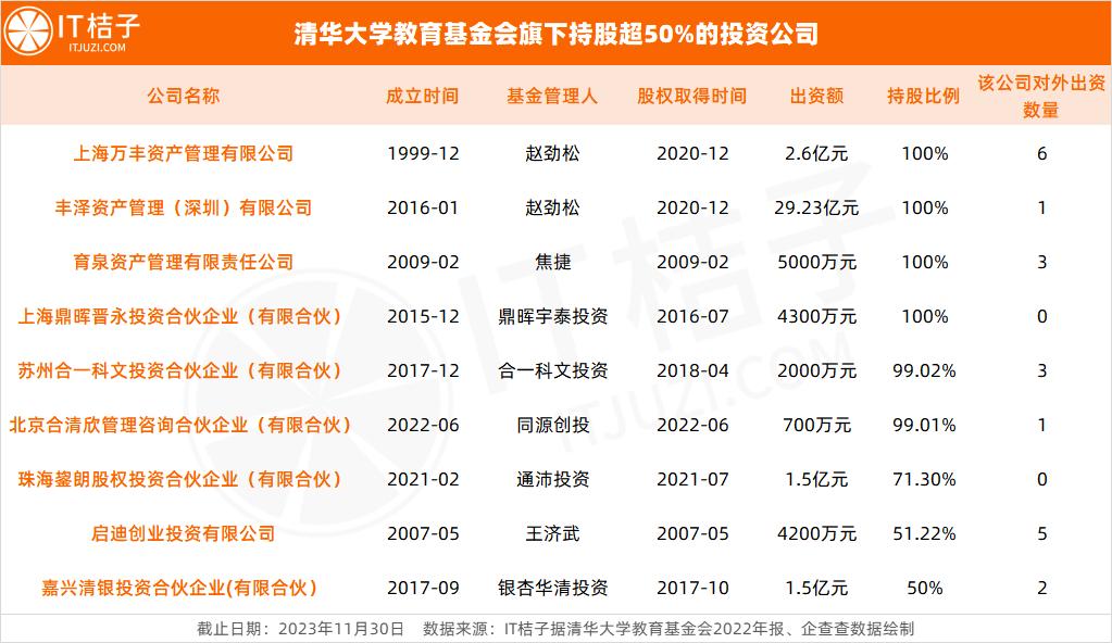 从持股比例来看,清华大学教育基金会持股基金公司持股比例多集中在 30% 及以上,并且有 4 家公司为全资控股。