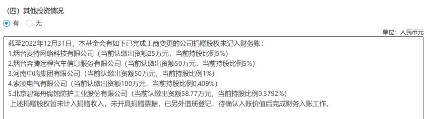 此外,北京大学教育基金会受赠获得的其他公司股份还包括索凌电气(持股 0.4%)、碧海舟(持股 0.38%)、中瑞集团(持股 1%)、奔腾远程汽车(持股 5%)、麦特网络(持股 5%)。