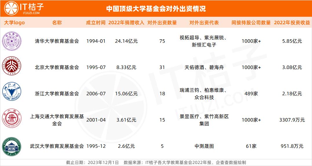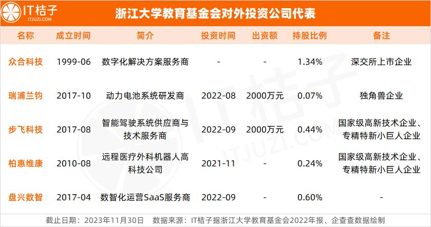 2017 年 7 月,浙江大学教育基金会出资 2 亿元 100% 持股浙江大学创新创业研究院有限公司,该公司目前对外出资事件 5 起,间接持股 11 家公司。
