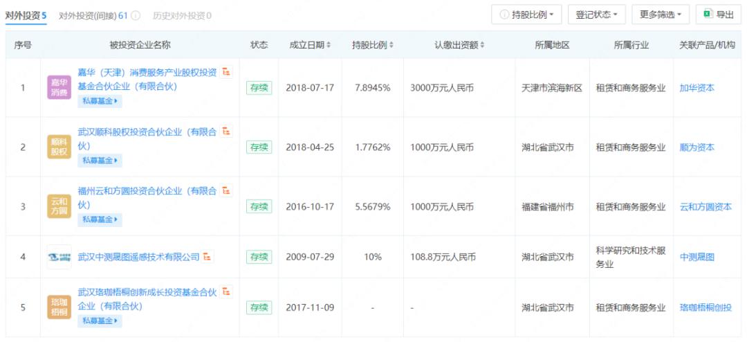 事实上,武汉大学教育发展基金会自成立至今的 5 次对外投资事件中,仅 1 起事件为参与创业公司的投资,该公司为中测晟图。据某招聘软件上介绍,中测晟图为武汉大学和中测新图 (北京) 遥感技术有限责任公司联合设立,是以武汉大学教育发展基金会投资该公司也就在情理之中了。