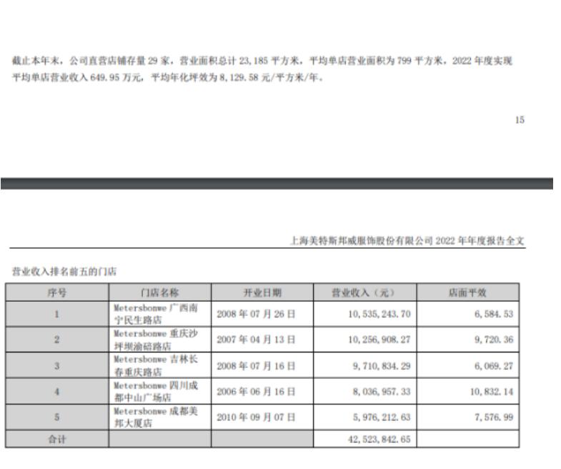 红星资本局注意到,成都美邦京都大厦店今年上半年的业绩并不差。据美邦服饰2022年年报、2023年半年报,成都美邦京都大厦店营收分别为597.62万元、631.78万元,在所有门店中均排名第五。但京都大厦店2022年店面平效为7576.99元/平方米/年,未达到美邦服饰直营店2022年的平均年化坪效水平。