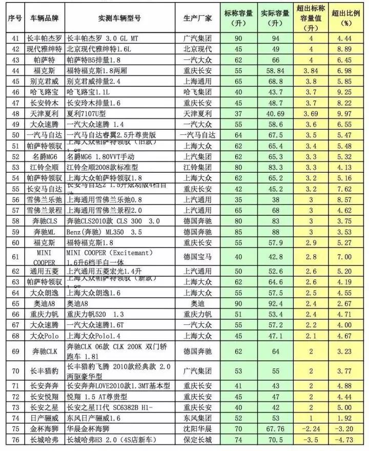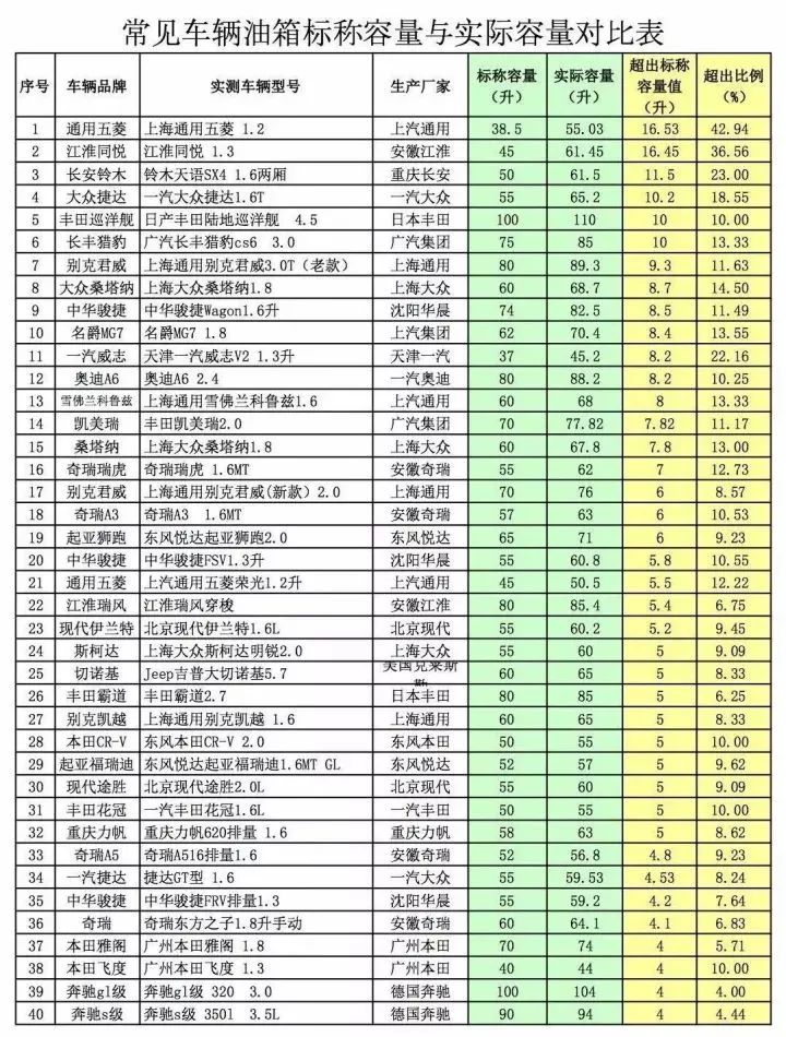 之前网上也流传过一个图,列出了常用车辆额定容量和实际容量对比,根据车型不同,各大厂家的车辆油箱均出现不等超出比。