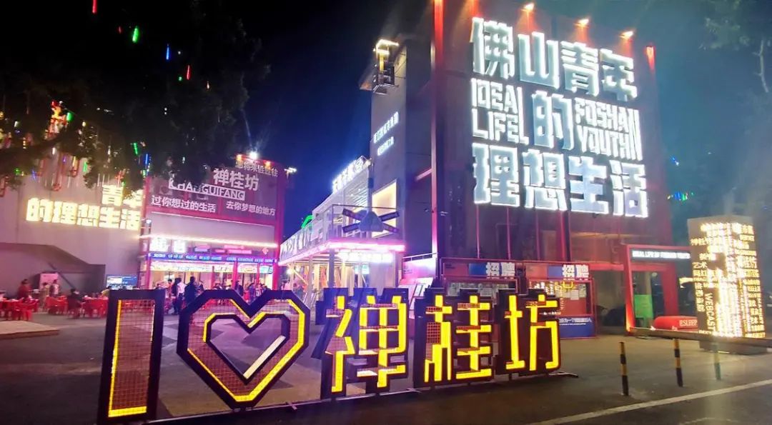 在佛山文华北路、南桂西路交会处,有这样一处有趣的地方:白天,聚集奇思妙想的青年人在这里生活、工作;夜晚,则变身成为车水马龙、灯光璀璨,霓虹与星空争奇斗艳的休闲娱乐好去处。