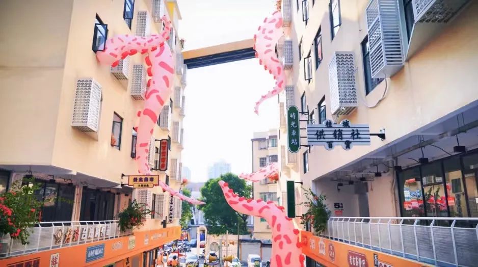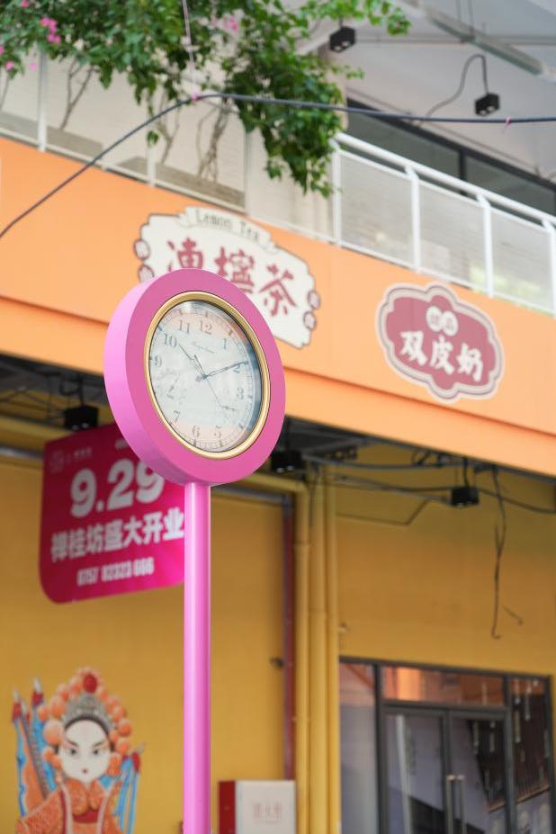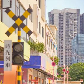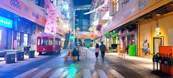 走进禅桂坊,大面积、高饱和的马卡龙色彩外墙映入眼帘,让人仿佛走进了动漫世界。特别是散落在街边各处的绿皮火车、时光电车、Q版人物等小装置,似乎有一种穿越时空隧道般的魔力将人拽入童年的动漫里。