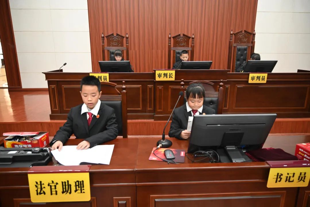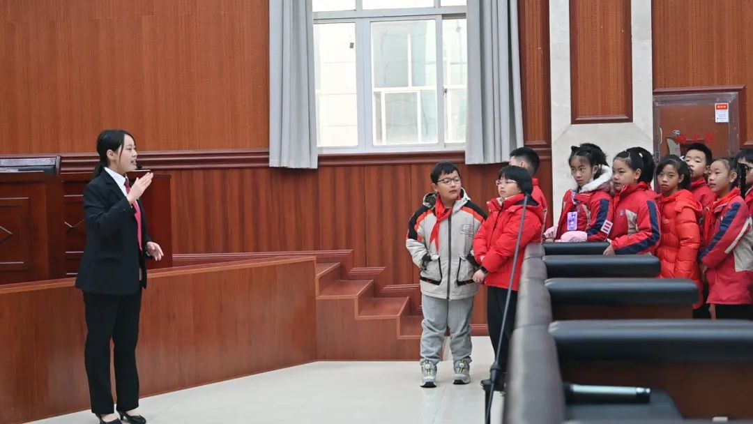 学生们沿着旁听庭审通道走进法院,稚嫩的脸上满怀敬畏、崇敬的神情,在安检处带着新奇和求知的热情叽叽喳喳地讨论着各类安检设施;在少年法庭和羁押室里,又换上了严肃认真的神态,仔细听着讲解;在看到欧城小学同伴们录制的法治宣传公益视频《强国复兴有我》里说出“我要当法官”时,也有人用稚嫩的语气坚定说道“我长大了也想当法官”;在审判庭上庄严神圣地有模有样“扮演”着角色“小大人模样”十足;在现场发放《未成年人保护法》宣传手册时,还有人想着说多带几份回去给其他的同伴一起学习......