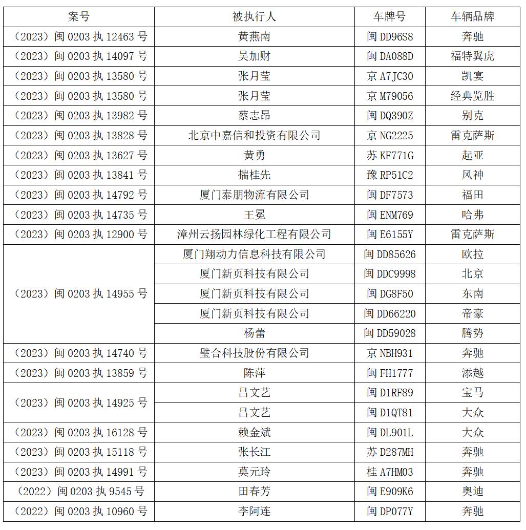一、责令被执行人自本公告发布之日起10个工作日内将你(单位)名下车辆交付厦门市思明区人民法院执行局(联系电话0592-5308945)。
