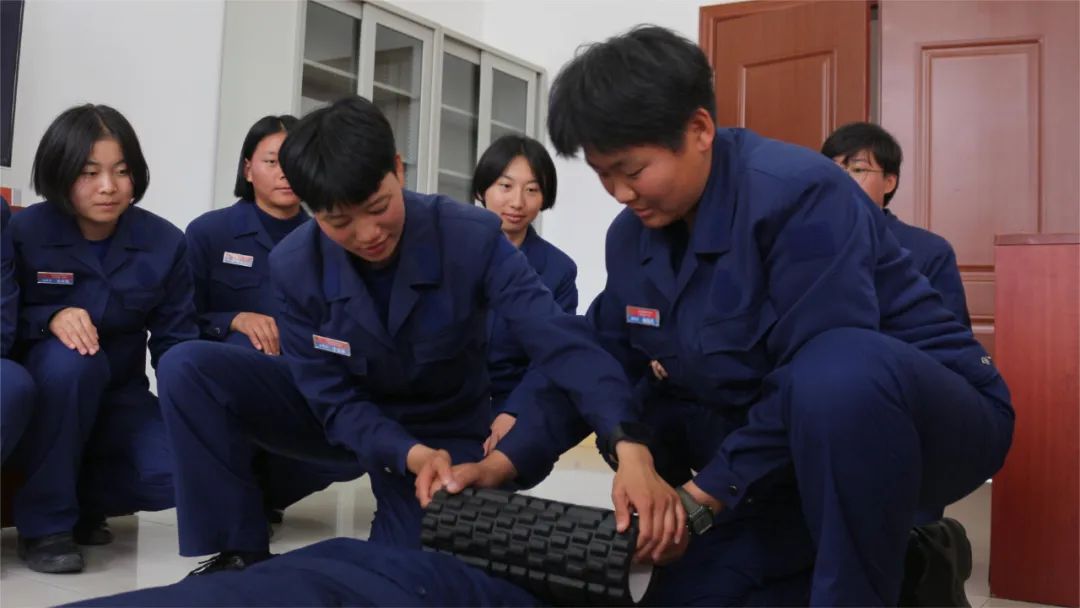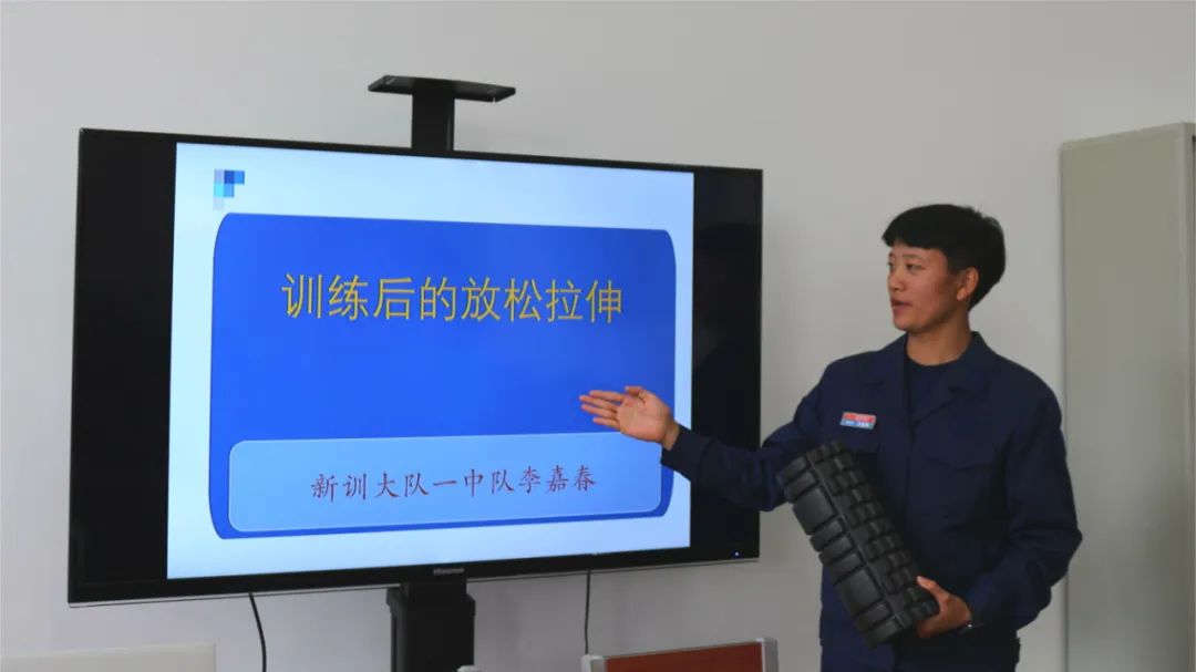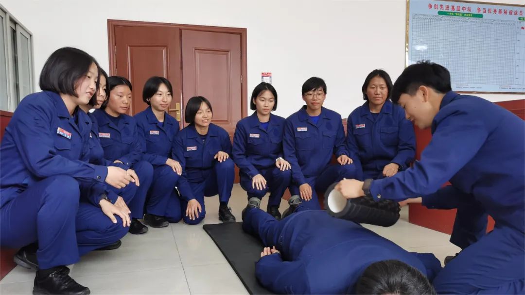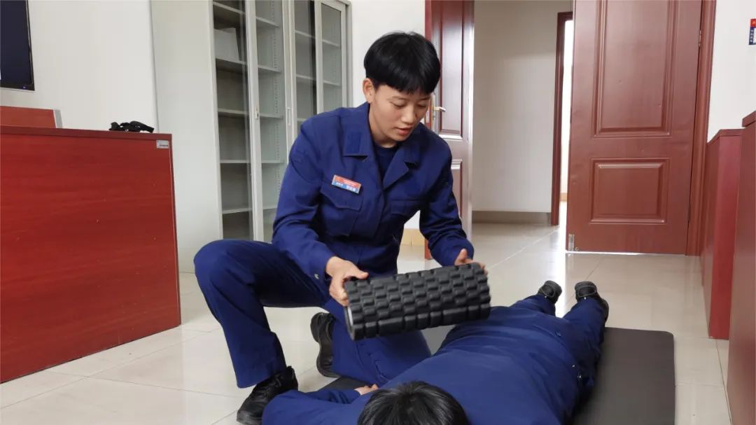 李嘉春入队之前曾进行过长达六年的专业体育训练,对运动相关理论知识掌握比较全面。为了有效预防延迟性肌肉酸痛僵硬和训练伤的发生,更加科学的进行组训,李嘉春以“利用泡沫轴放松”为重点,对训练伤预防、运动后全身各部位肌肉放松进行了详细讲解,将讲解与动作示范相结合,并组织各位队员进行体会练习,在练习过程中解答队员的疑难困惑。