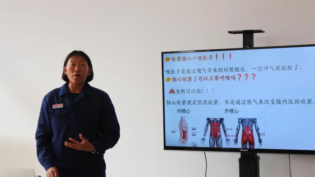 洛桑旺姆有针对性的为大家讲解示范了原地蹲起走、仰卧举腿阻力练习等几组核心力量练习。课上,她从发力点、发力方式和易犯毛病3个方面,把专业知识和科学训练方法传授给大家,让大家深刻感受到正确使用力量在运动过程中的重要性。