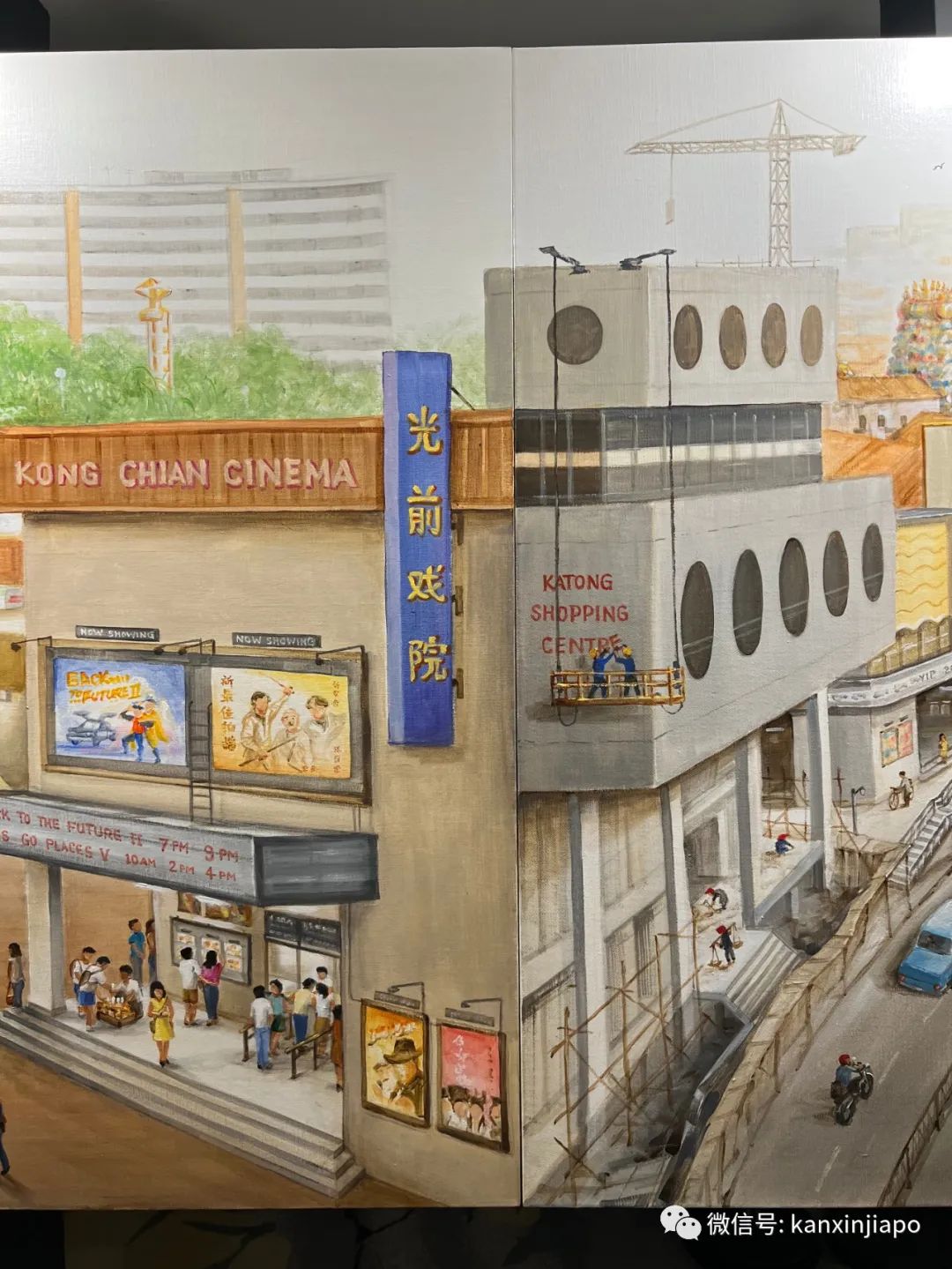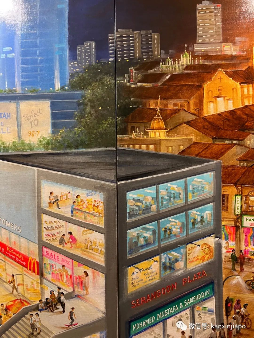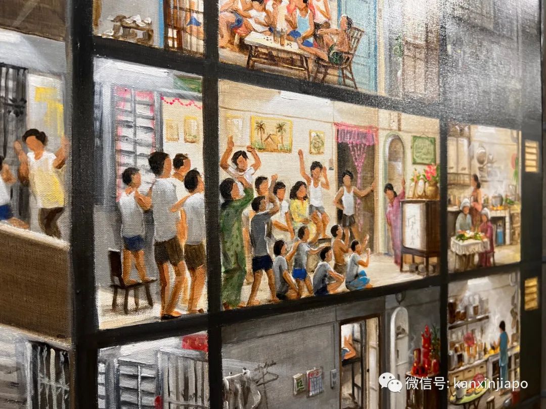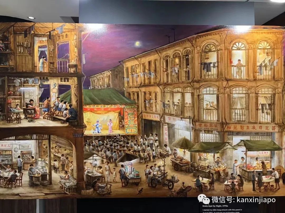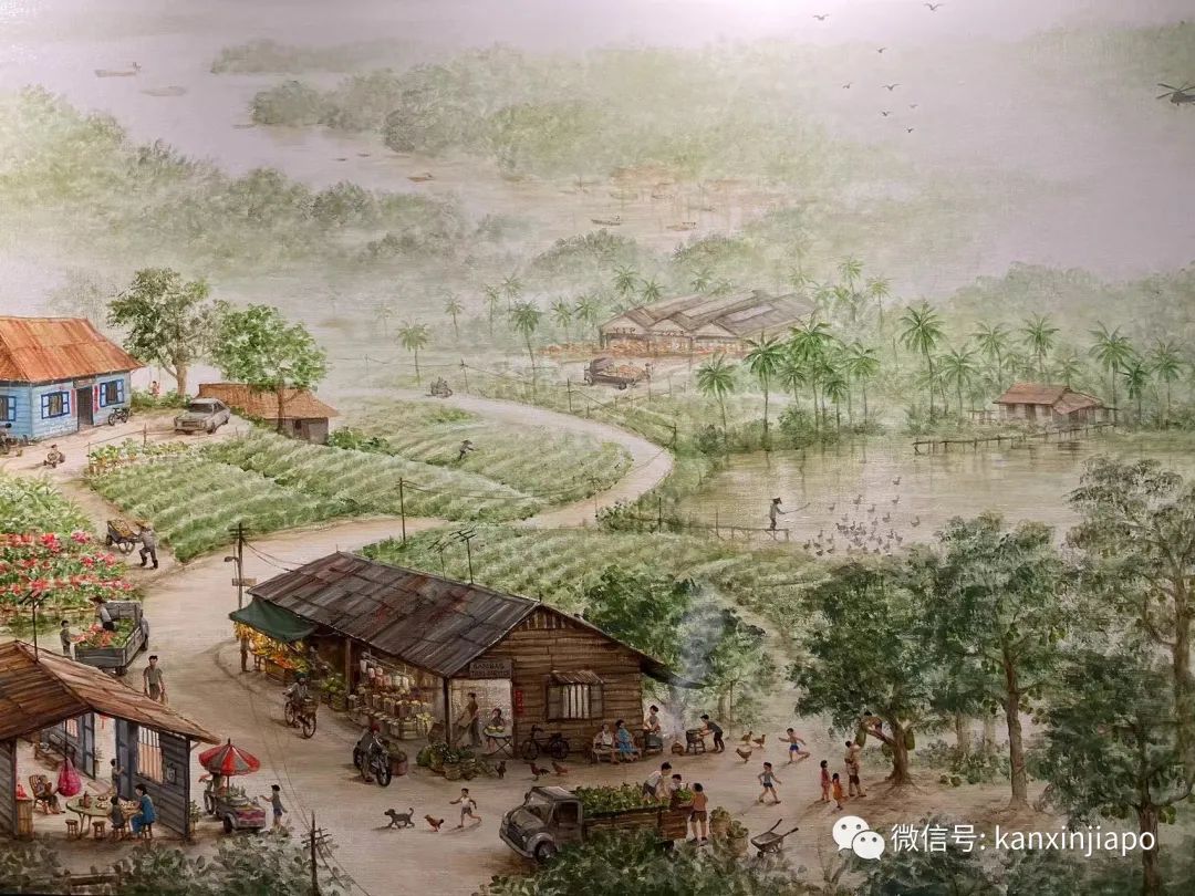 这一张右上角的乌节路商店,在下一张左上角就成了实龙岗的商店。画家的匠心独运,使得作品看起来既是一个整体,又各自有各自的场景。
