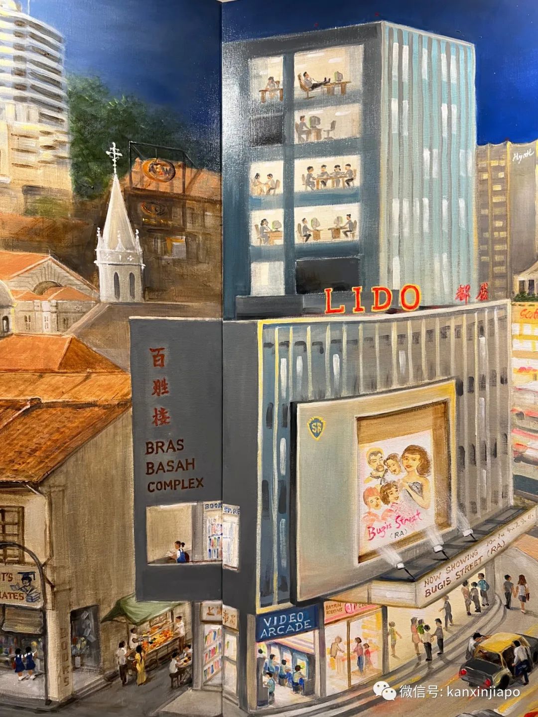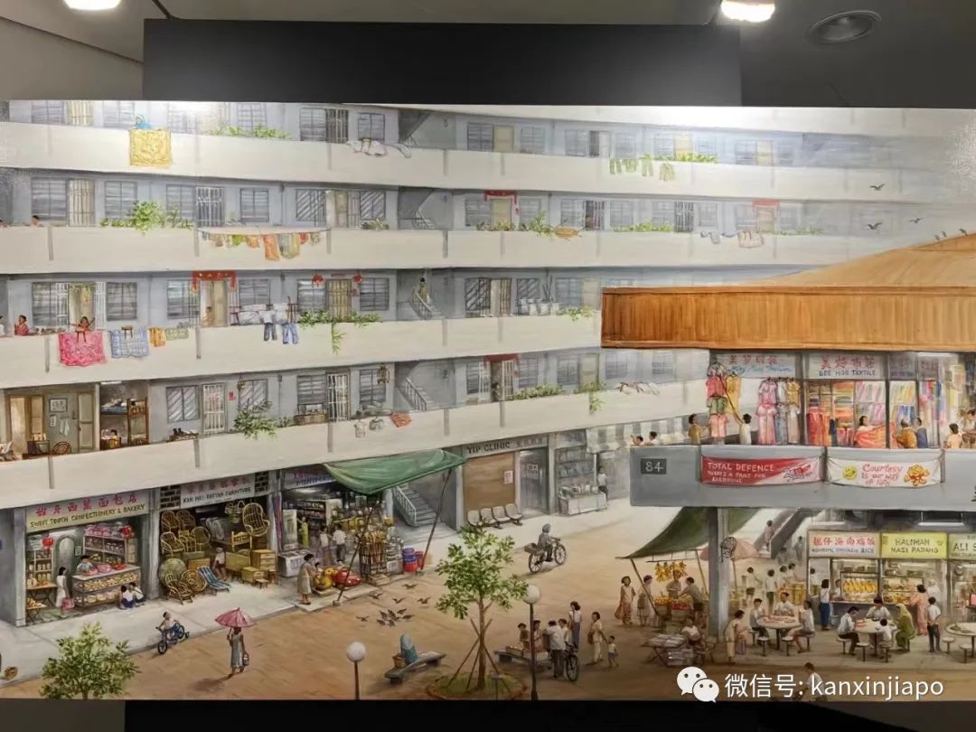 虽然是间隔着创作,但是整体的方案他还是心中有数的。有趣的是不少画布边缘有巧妙的联系,留意以下这两张图的左上角,这一张的写字楼,另一张就成了组屋的一部分。