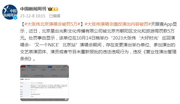 据中国新闻周刊微博报道,天眼查App显示,近日,北京星台光影文化传播有限公司被北京市朝阳区文化和旅游局罚款5万元。处罚事由显示,该单位在10月14日晚举办“2023大张伟‘大好时光’巡回演唱会-‘又一个NICE’北京站”演唱会期间,存在变更演出举办单位、参加演出的文艺表演团体、演员或者节目未重新报批的违法违规行为,违反《营业性演出管理条例》。
