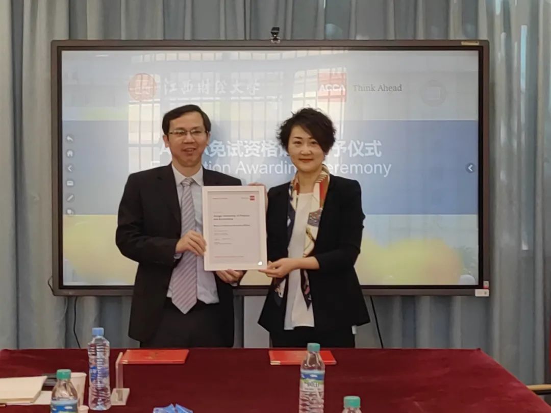 ACCA华中区总监朱晓云女士向江西财经大学会计学院院长周冬华教授颁发ACCA豁免认证证书。