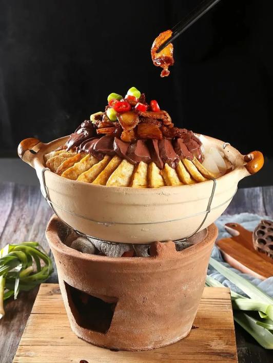 三层楼风炉一层是猪肉汤煨透的萝卜,二层是煎得两面金黄的农家盐卤豆腐和大块新鲜猪血,三层是香到骨子里的带皮五花肉,不仅美味buff叠满,更有着事事更上一层楼的好寓意。