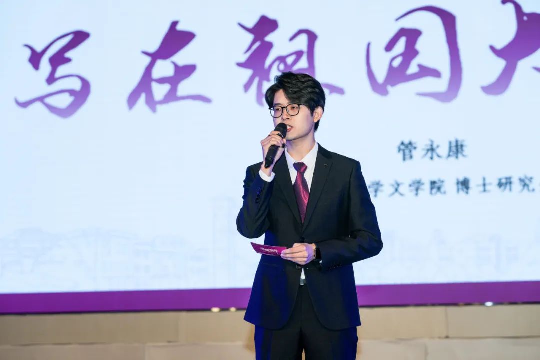 “十载求学时光,是矢志不渝的热爱、始终如一的初心、心无旁骛的定力”,“南开十杰”荣誉称号获得者代表、文学院2021级博士生管永康在发言中分享了自己扎根中国大地写论文,在守正创新中传递南开声音的科研之路。