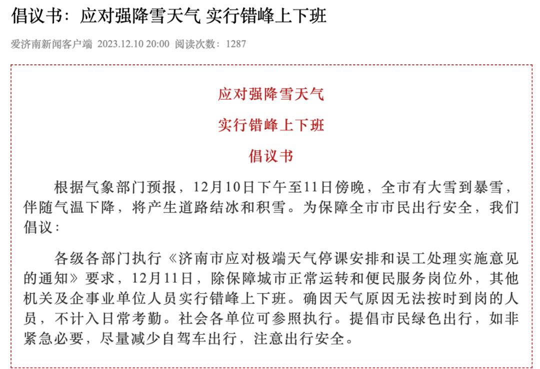 12月10日,济南发布:应对强降雪天气实行错峰上下班倡议书。